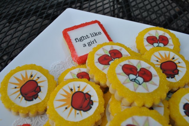 29Oct2012 Kick Boxing Fest Posted in Uncategorized by mamamayerbakery Love my kick boxing instructor. Made these for her on a special day. One of her favorite sayings is to “fight like a girl.” Share this: Click to share on X (Opens in new window) X Click to share on Facebook (Opens in new window) Facebook Like Loading... Related