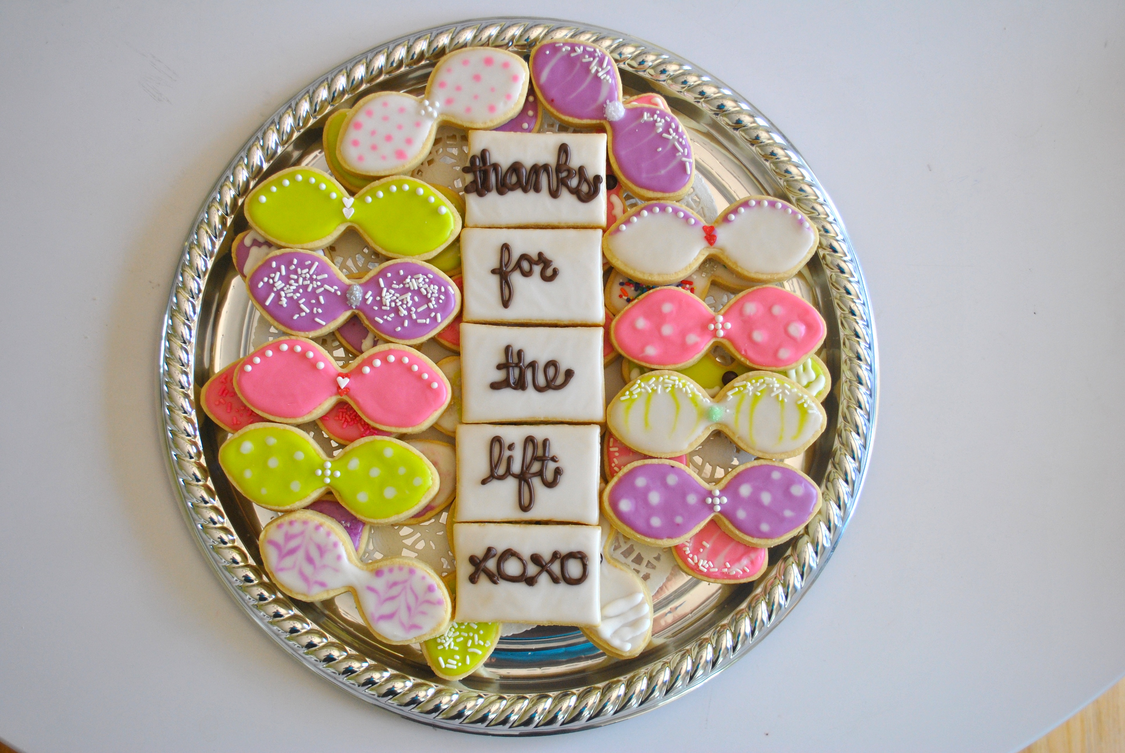 Okay, funny story… a friend’s daughter is about to go on stage when there is an “equipment malfunction.” They are desperately searching for a strapless bra to no avail when the mom’s best friend hands her a Victoria Secret special, still warm from original use! New meaning to giving the shirt off your back (or bra off your front)! She saved the day and here is the tray that was ordered to thank and celebrate it!
