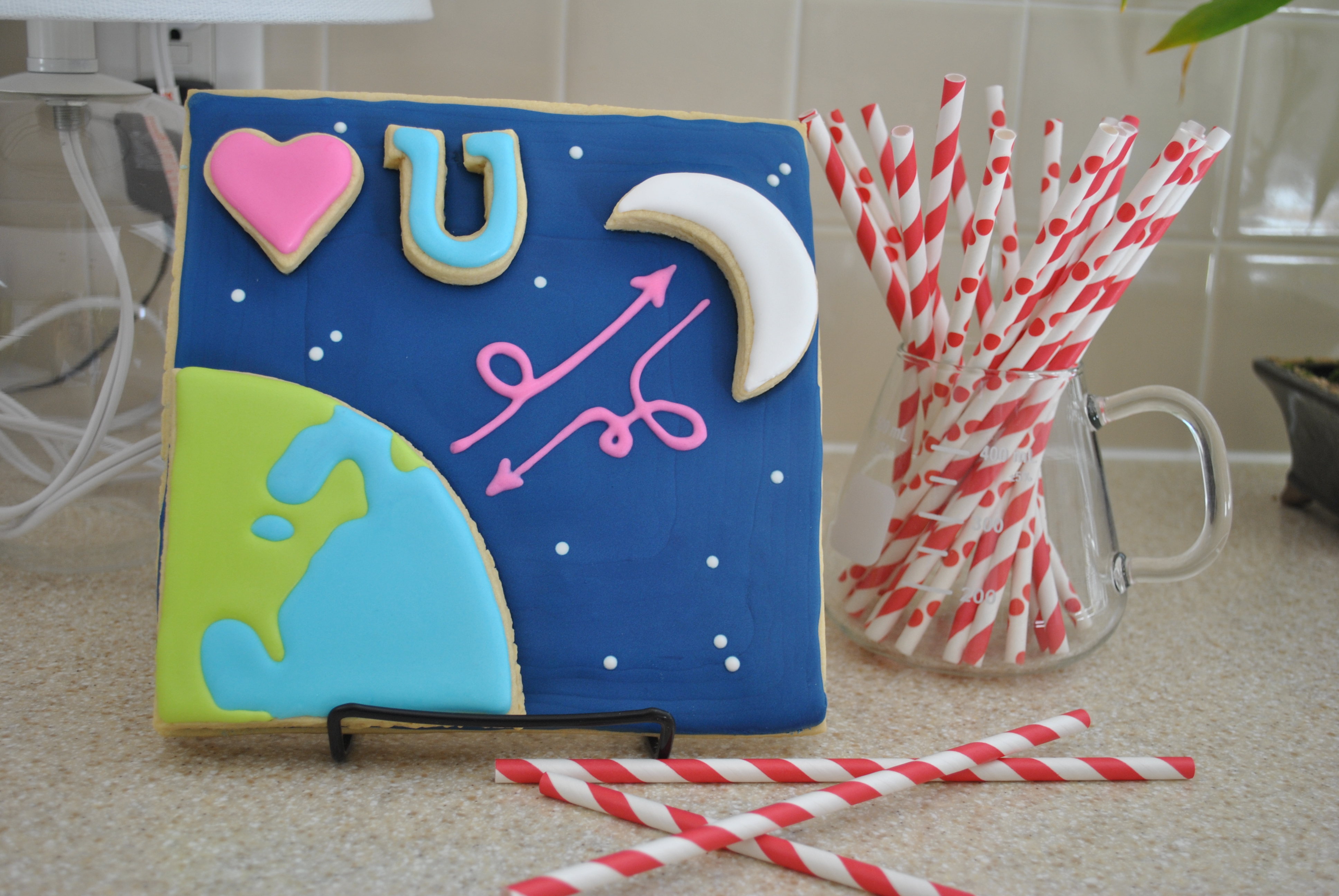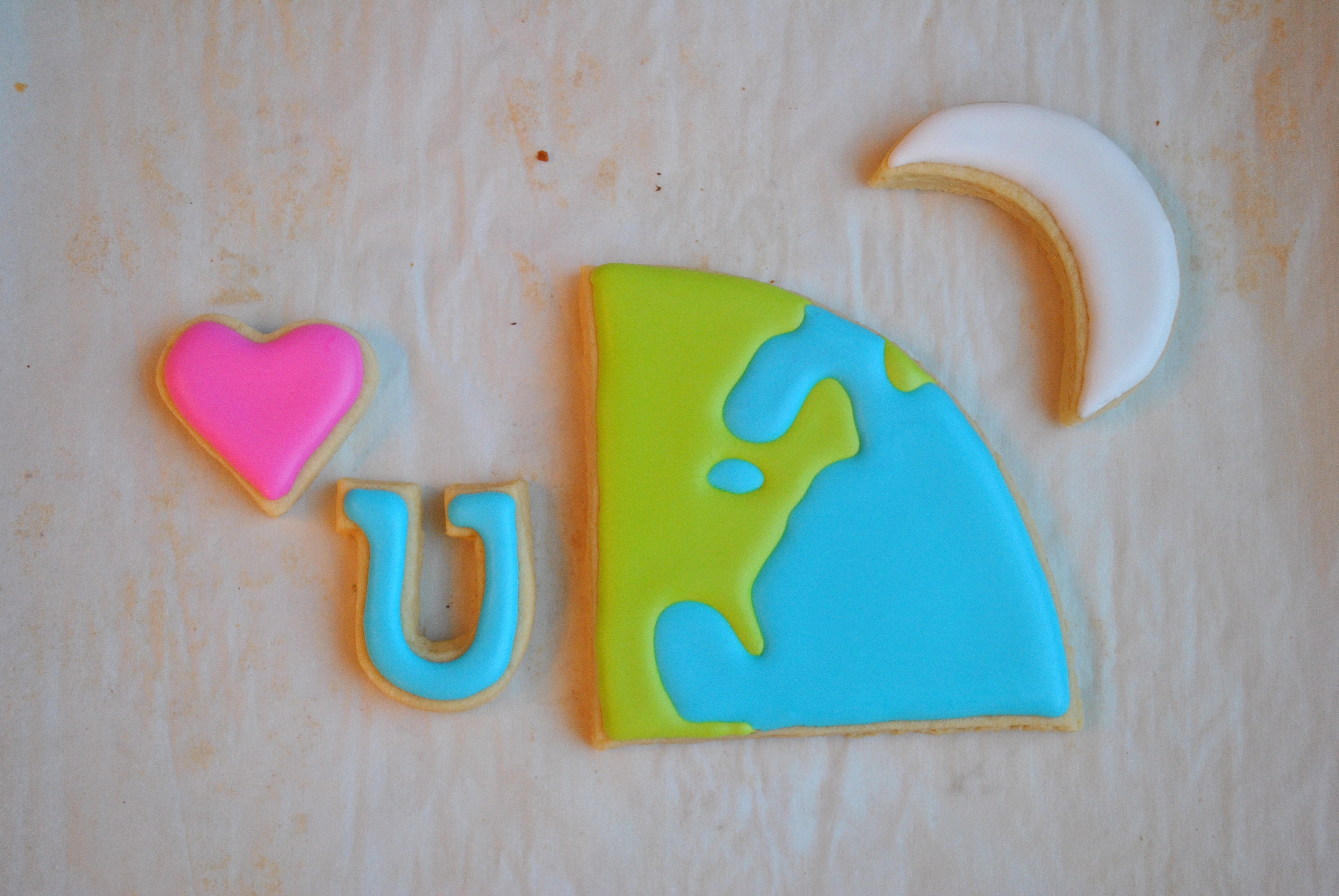 The large cookie is 7.5″x 7.5″ . I free hand cut this from the dough. I also did not have a big enough cutter to make the quarter earth so I used my trusty trifle bowl. Hey, whatever works, right?