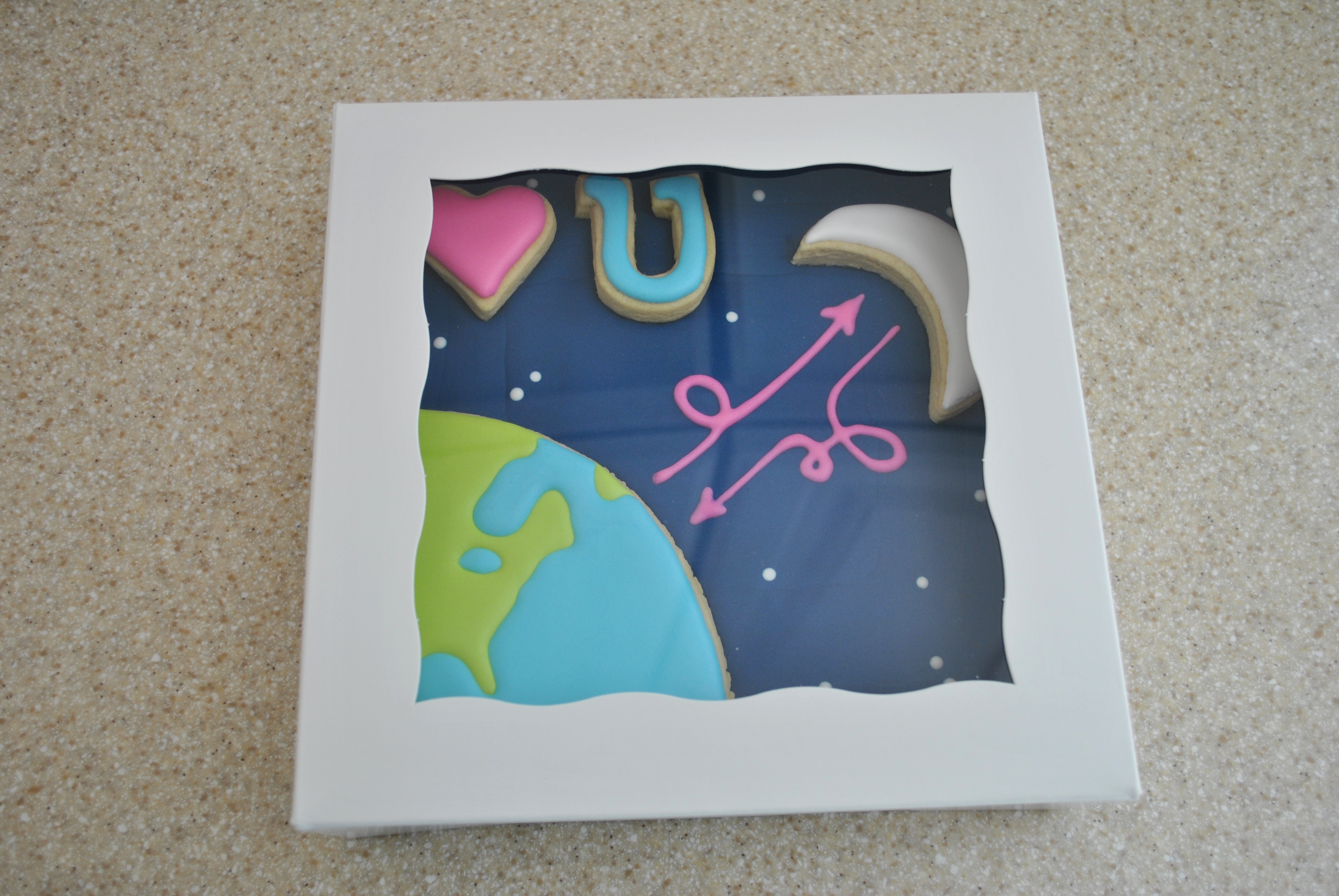 I piped in the arrows with royal icing after the base dried about 4 hours. Colors used were AmeriColor deep pink, sky blue, electric green, and royal blue (with a touch of black for background). It fits perfectly into a 8×8″ box to ship to my sister! Thank you kolettehall for the free printable!