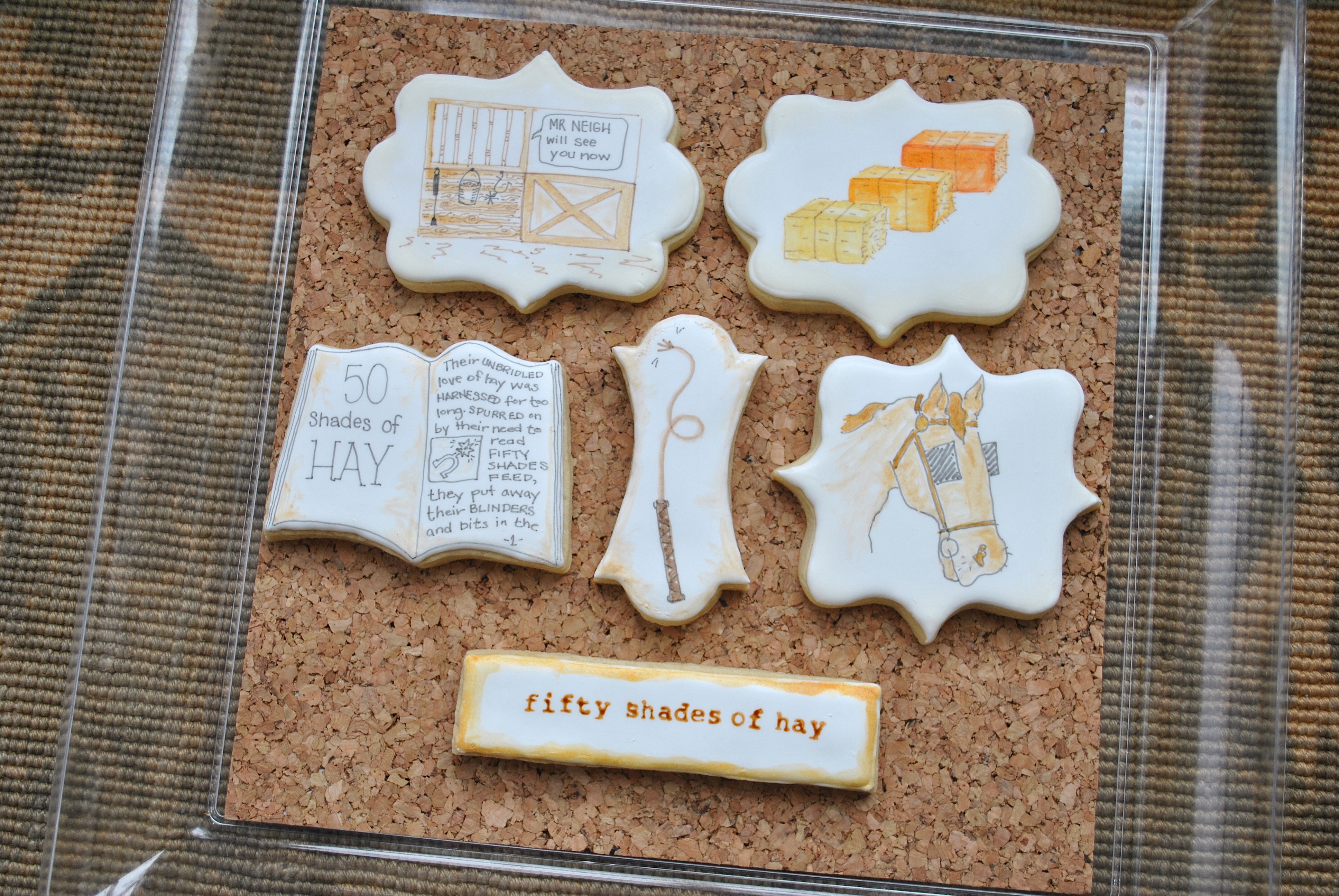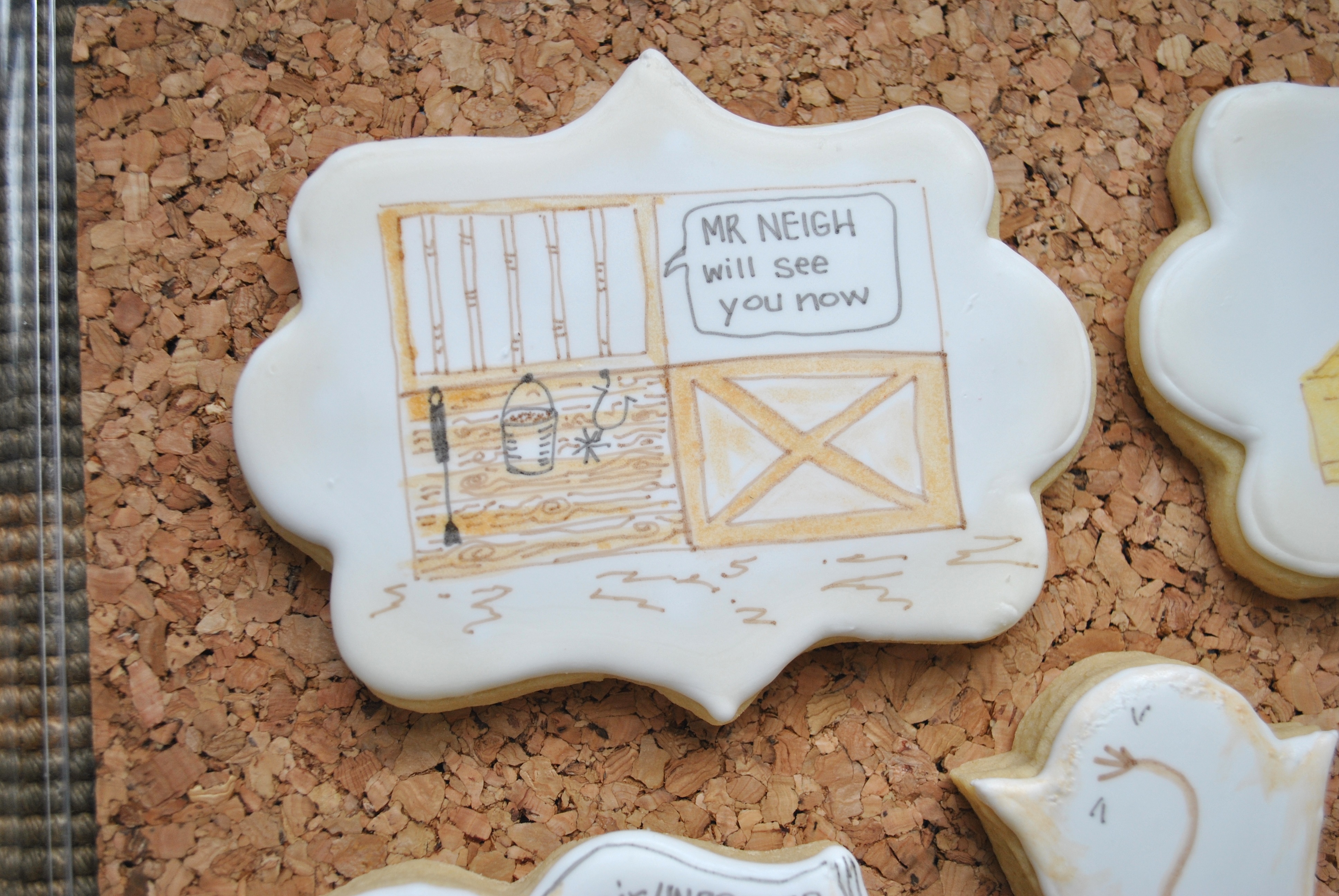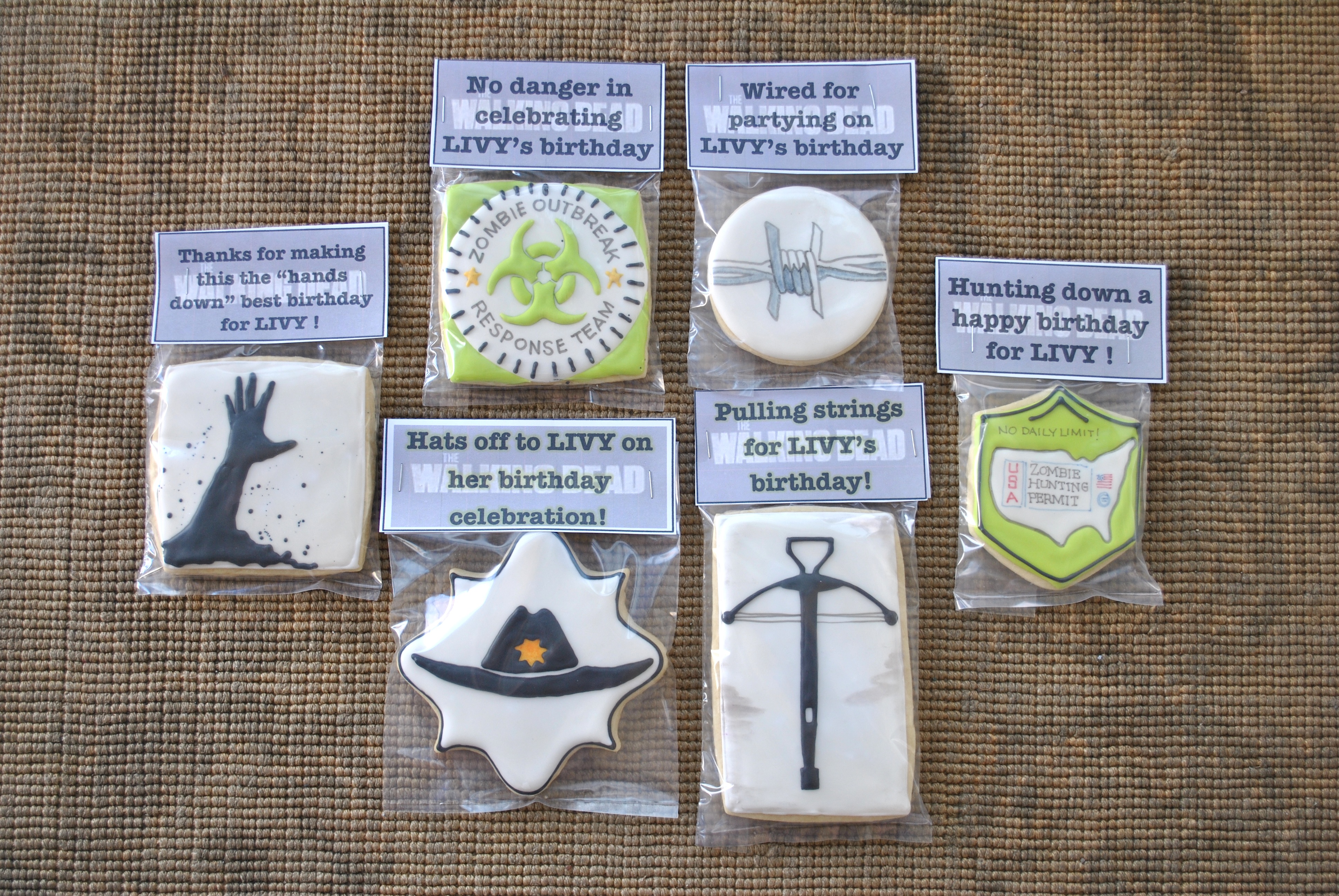 Funny. All of my Walking Dead cookie orders have been for KID‘s birthdays. Like under 14. I am always SUPER appreciative of anyone who likes my cookie designs enough to request some but I figured The Walking Dead fans would be older???! The reason I mention this particular sidebar is the dilemma of coming up with ideas that are appropriate. That was particularly important for this order- the favors were being given out in school. Luckily, challenges that stretch the imagination are never a bad thing. Here are the resulting Carl-, Daryl-, prison-, zombie-fied cookies, “splattered” with a touch of humor, “not dripping” with gore.