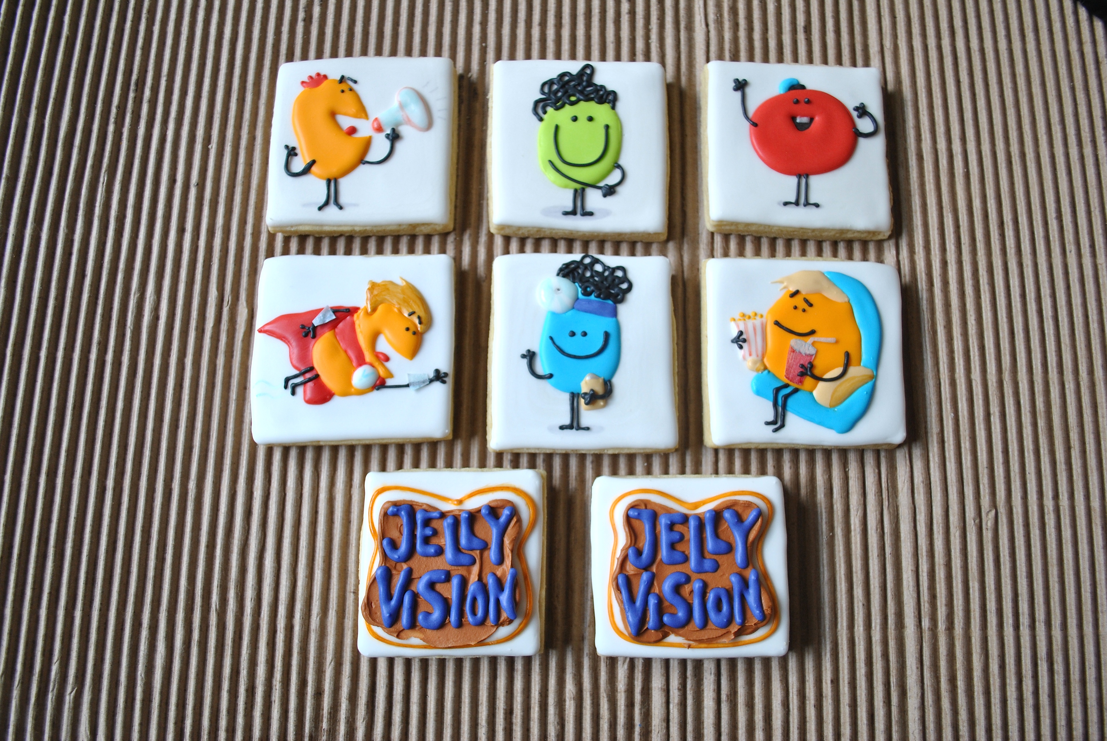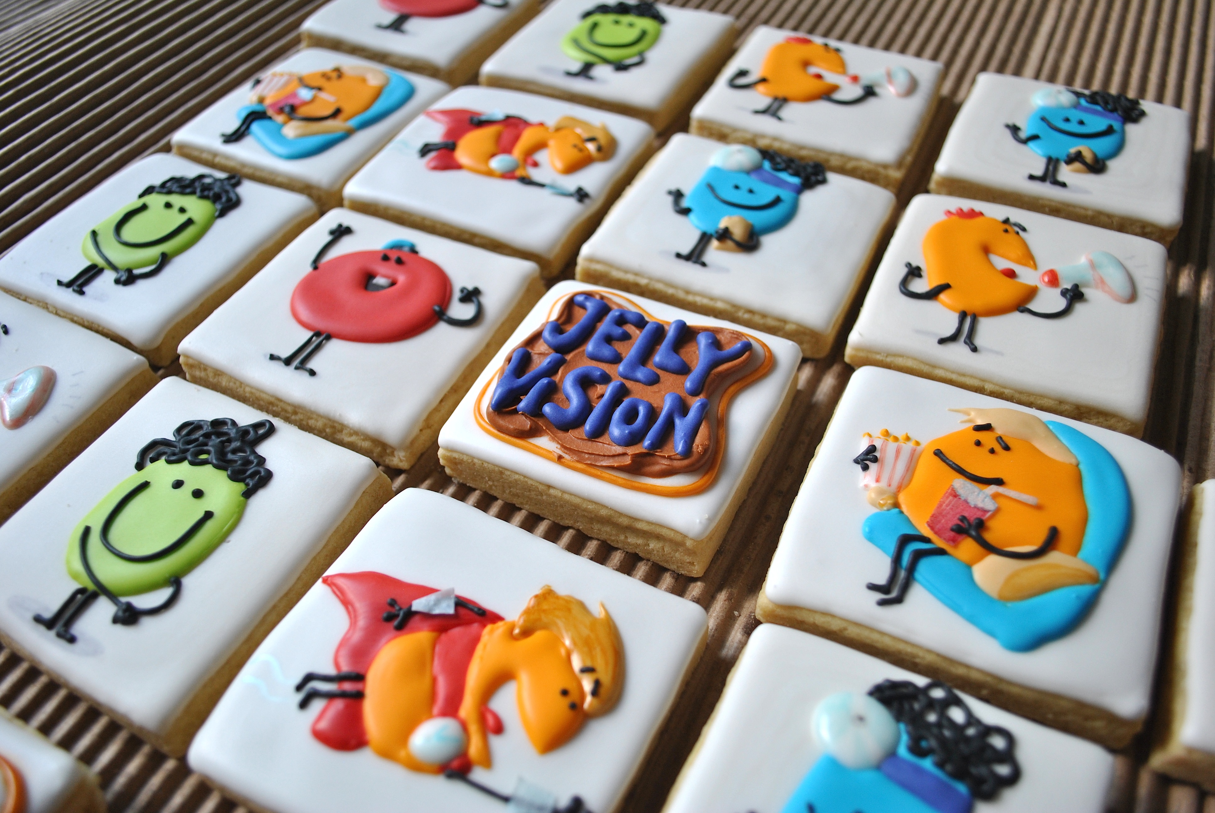 Our youngest interned at Jellyvision this summer and had a stinkin’ blast! Learned a ton and so, so enjoyed the folks there. I think I want to work there when I grow up. Jellyvision has these adorable characters, blobbies, they use as part of their communication tools. Yeah, I didn’t know what a blobby was either but, one look, and I knew they were meant to grace the cover of a cookie. Here’s part of the last.week.sweet.treats she took in…