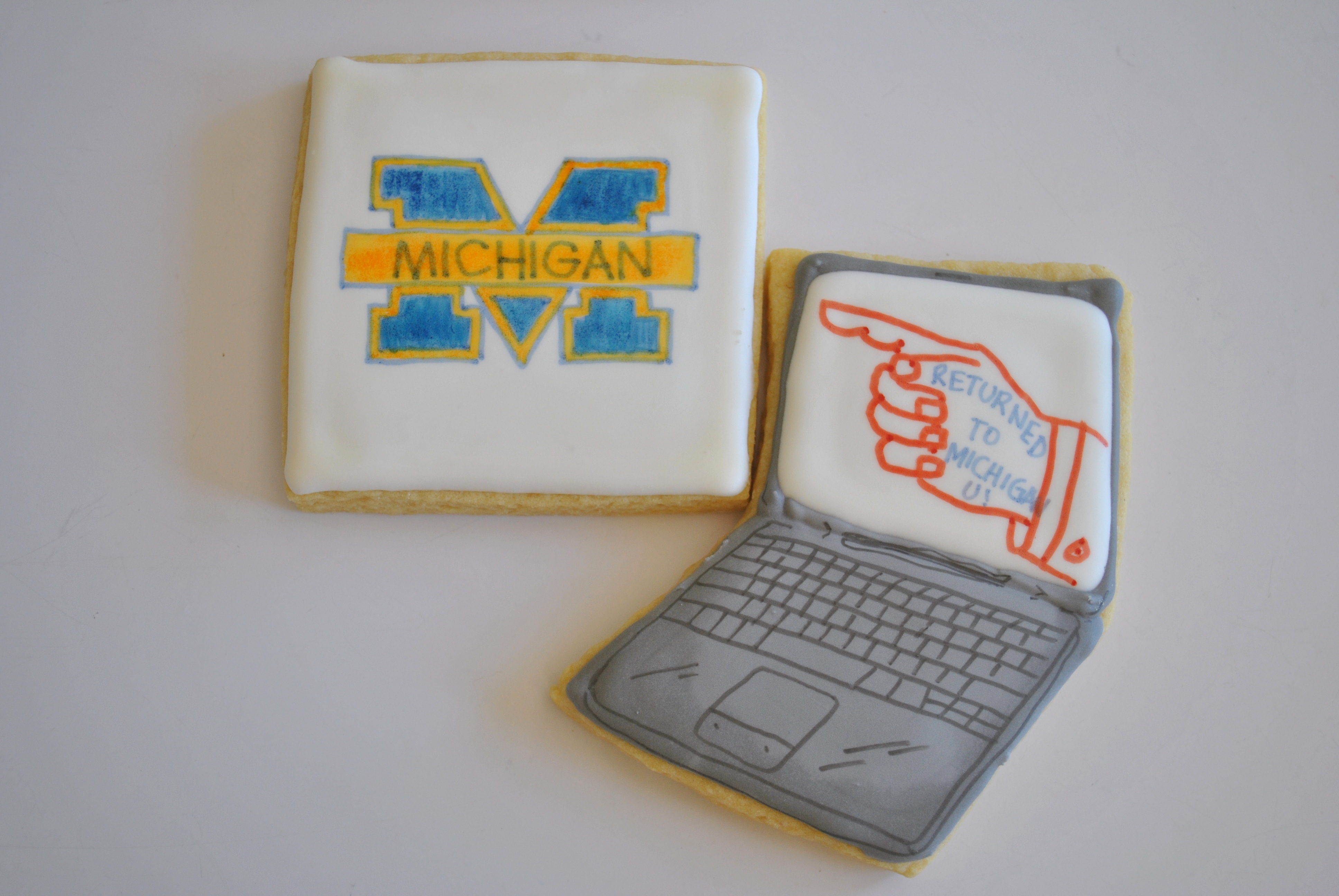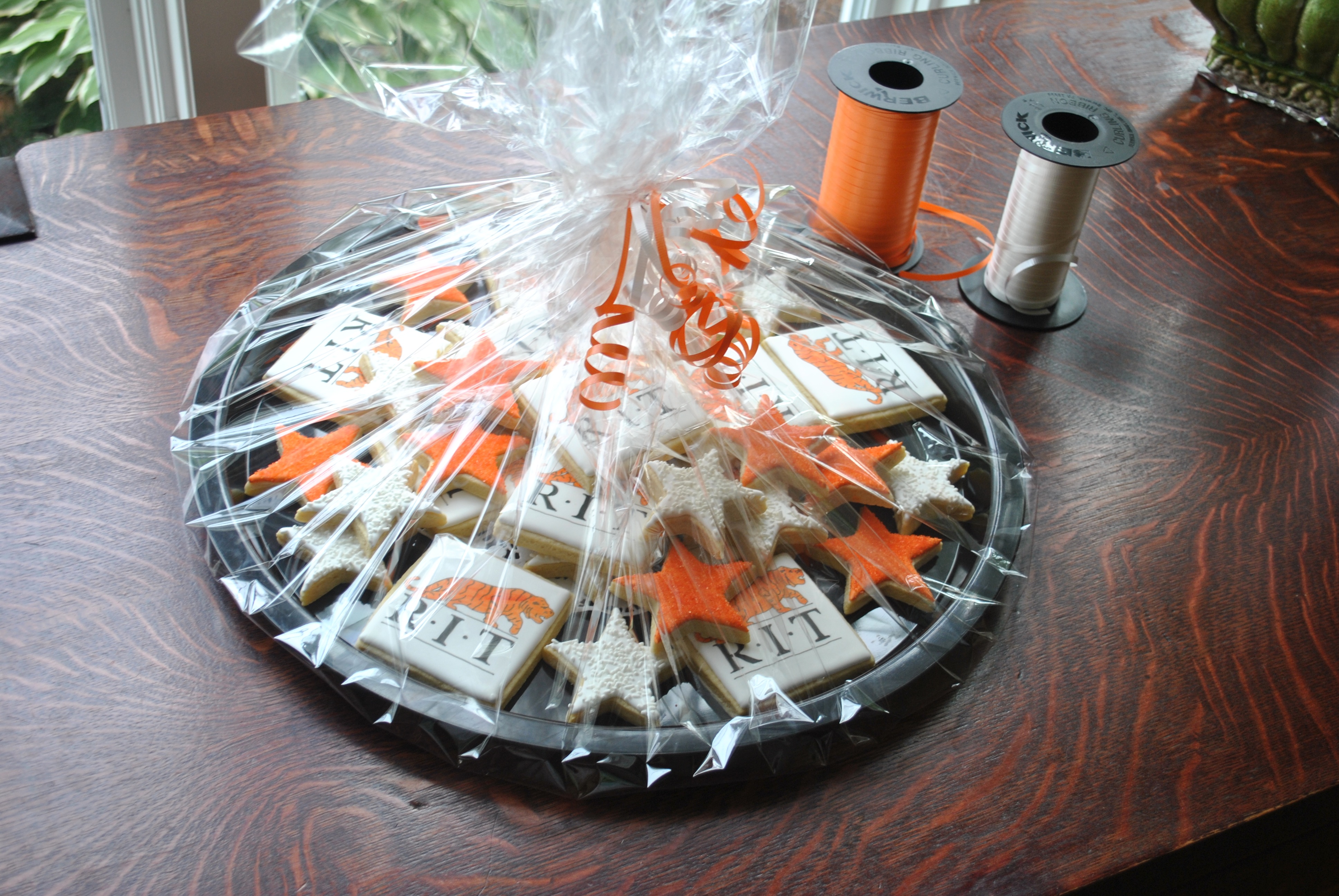 I have been on a bit of a watercolor.and.ink binge lately.  The cookie version of this involves thinned gel and edible ink pens.  This was the method used when asked to do a couple of as-you-go-back-to-university sets.  It is a nice option for making a logo when you don’t want too much royal icing on top of the cookie.