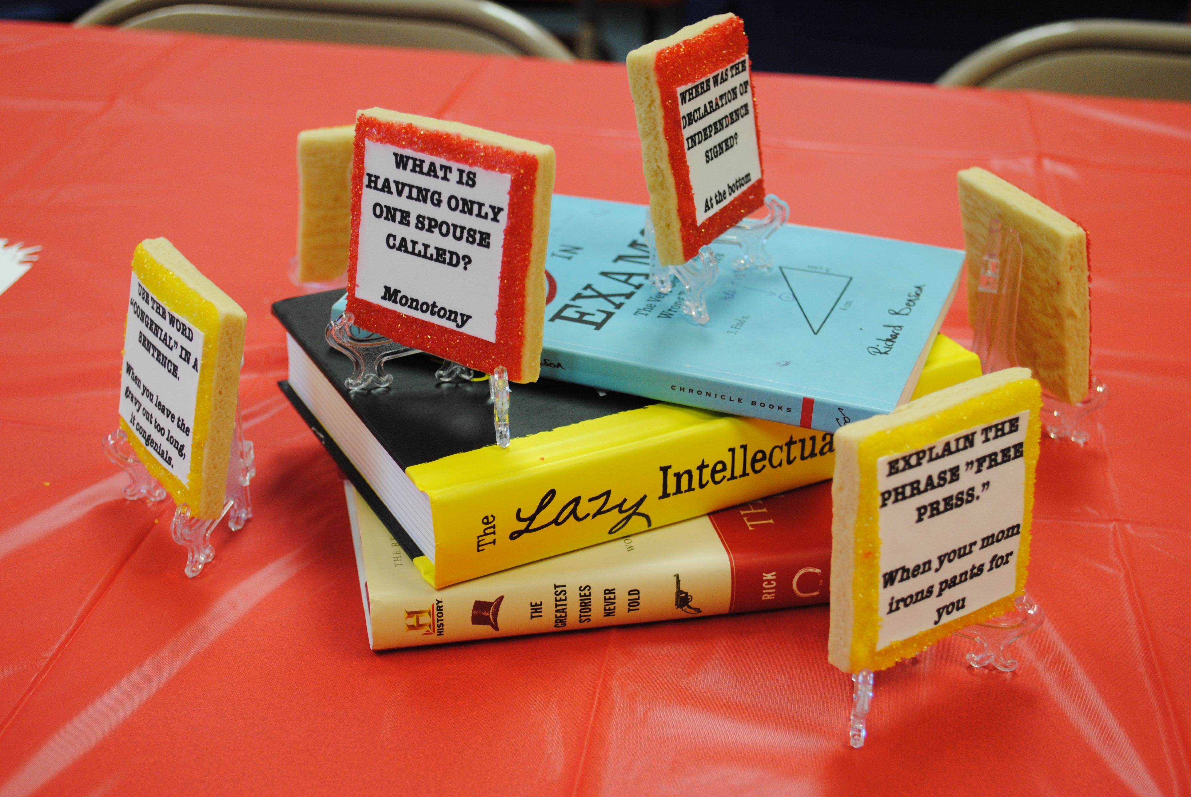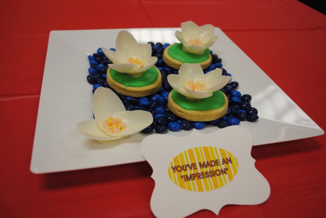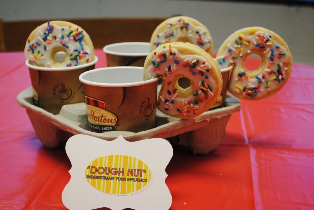 The first 2 centerpieces were ideas from the masters of cupcakes, Karen Tack & Alan Richardson. I changed things up a bit to fit cookies and our location. The Tim Horton’s cups were filled with brown M&Ms. The last seemed appropriate for high school teachers. 🙂